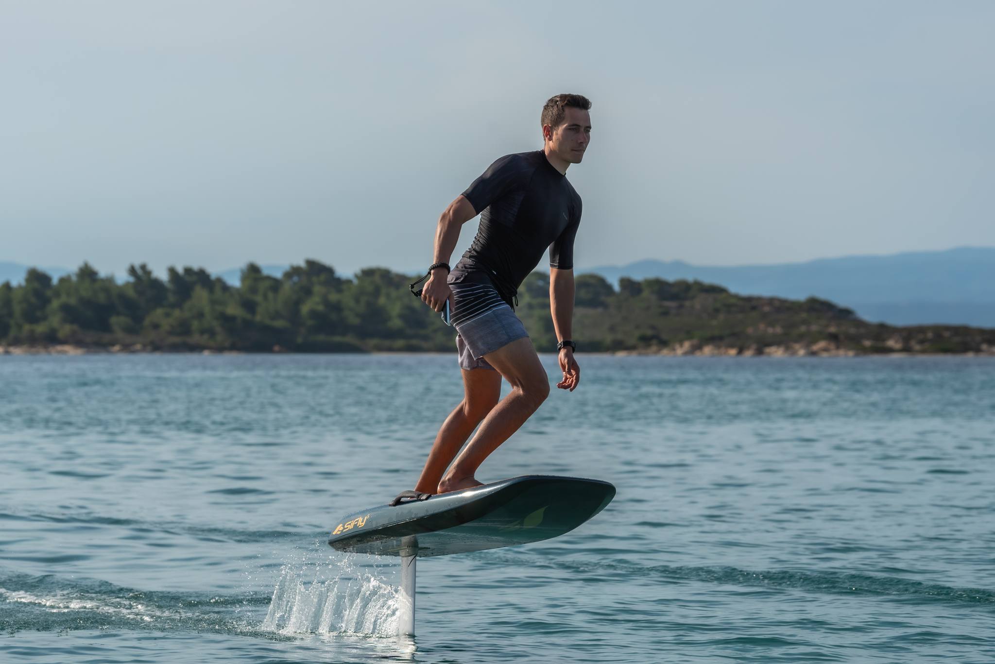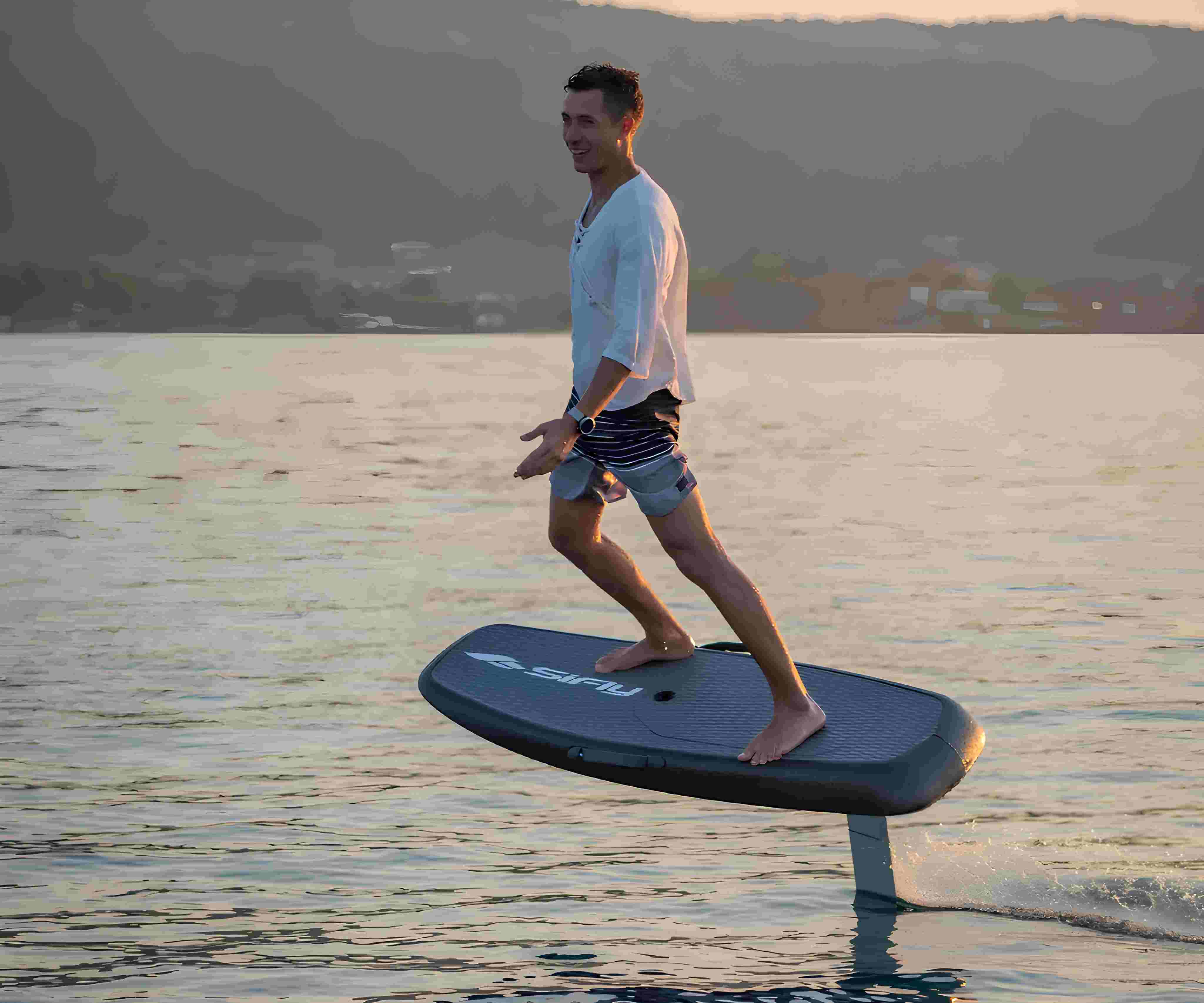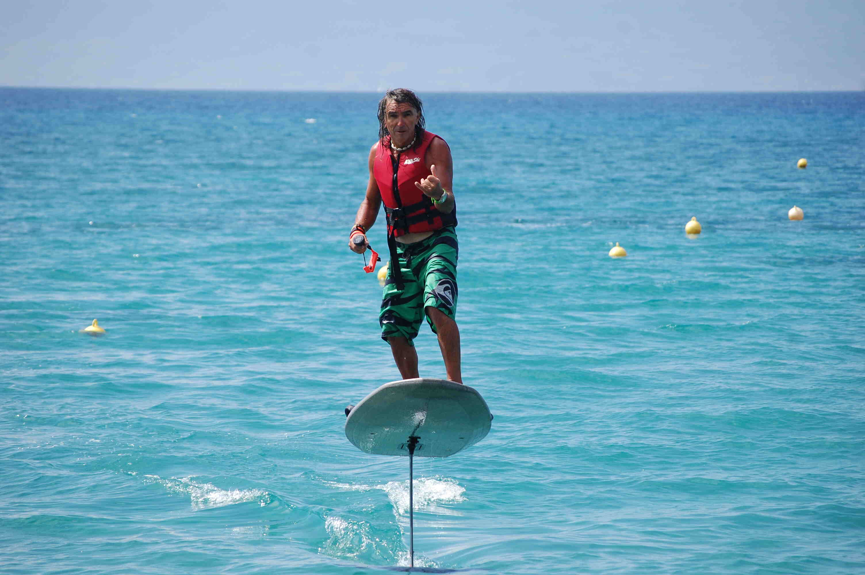 E foil it is an electrical board with hydrofoil and battery. Works with a wireless controller with a trigger or handlebar which we control our speed. A helmet with a wireless headset, microphone waterproof is included for learning, to communicate from distance for help and instructions.